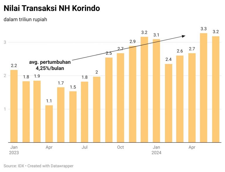 Pertumbuhan pendapatan tersebut didukung kooleh perolehan nilai transaksi yang melejit hingga 69,33% sepanjang semester pertama 2024 dibandingkan periode yang sama tahun lalu. Berdasarkan data IDX, nilai transaksi NH Korindo sepanjang paruh pertama 2024 senilai RP17,15 triliun.
