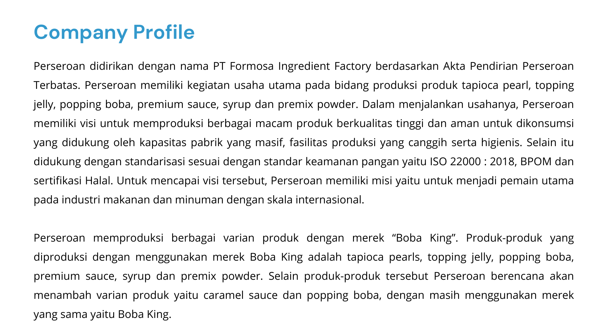 Information of PT Formosa Ingredient Factory Tbk (BOBA) IPO