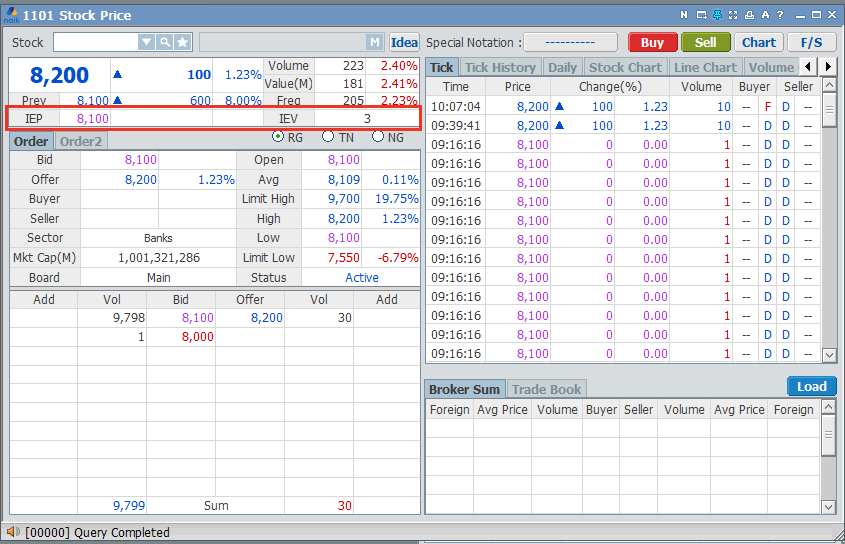 IEP adalah harga dimana volume terbanyak yang dapat dijumpakan berdasarkan posisi orderbook terakhir, sedangkan IEV adalah volume terbanyak yang dapat dijumpakan berdasarkan posisi orderbook terakhir. Perhitungan IEP dan IEV menggunakan metode yang sama dengan metode perhitungan Harga Pembukaan dan Harga Penutupan yang membedakan adalah IEP dan IEV dihitung setiap saat dan disebarkan setiap terdapat perubahan pada orderbook.