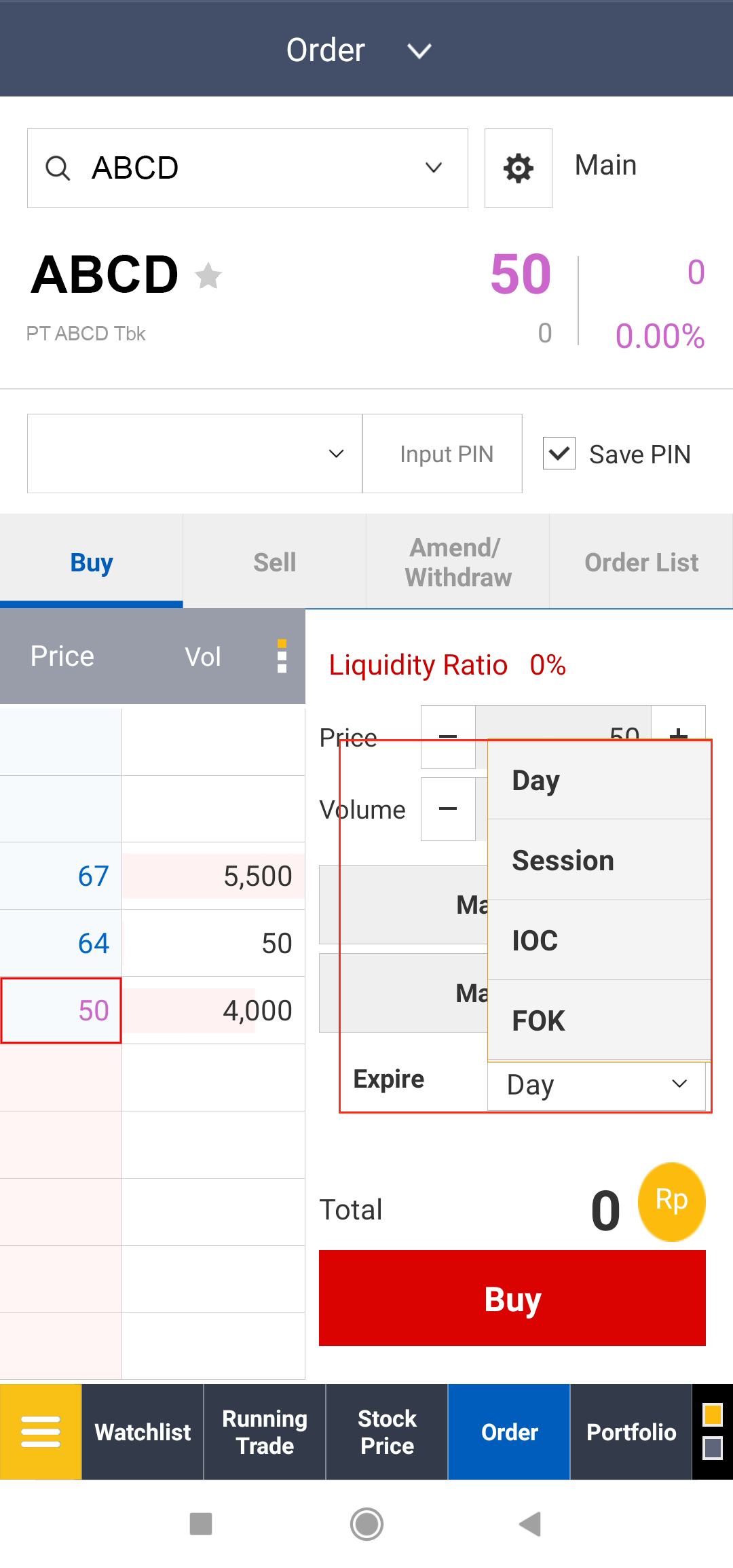 1. Fill and Kill (FAK): Market order dengan kondisi Fill and Kill (FAK) akan memenuhi jumlah volume yang dipesan secara seketika, sesuai dengan ketersediaan volume di orderbook. Apabila terdapat sisa volume yang belum dapat terpenuhi, maka volume order tersebut akan di-withdraw. Dengan demikian, dimungkinkan order terpenuhi secara parsial.